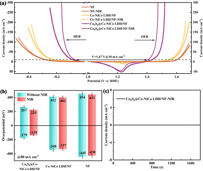 图8 电极在近红外激光照射下的性能,(a)LSV极化曲线;(b)80 mA·cm−2HEROER的过电位;(c)近红外光照射下Co9S8@Ce-NiCo LDH电极的无偏压I-T曲线