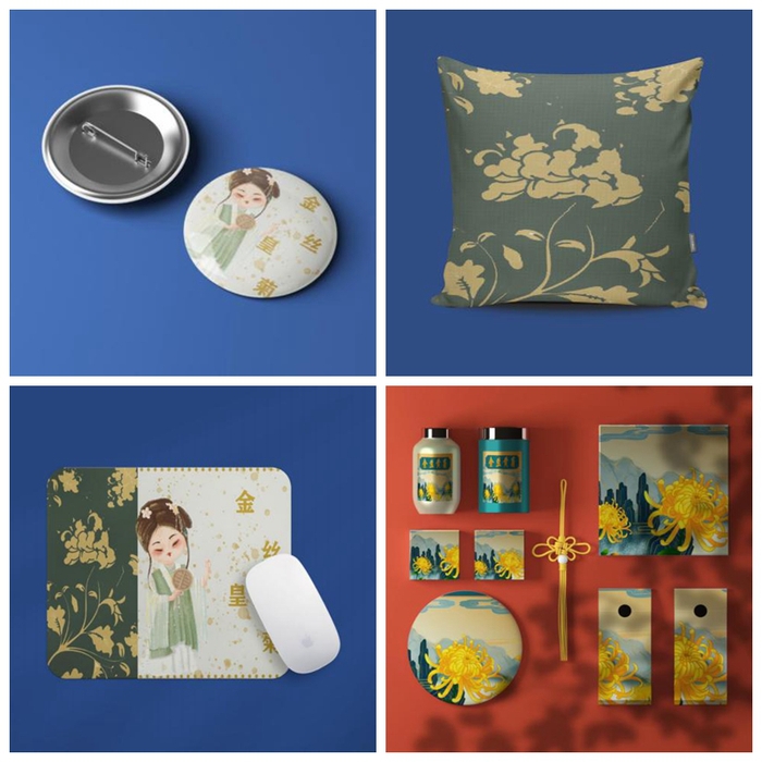 7月15日,经过队员们的共同努力,金丝皇菊的包装设计任务基本完成。紧接着,队员们又开始着手制作金丝皇菊的周边文创。同学们分工合作,有人绘制文创视觉效果图,有人制作包装效果图,也有人制作文创成品的PPT……众人拾柴火焰高,在大家的共同努力下,文创产品的设计取得了明显成效。