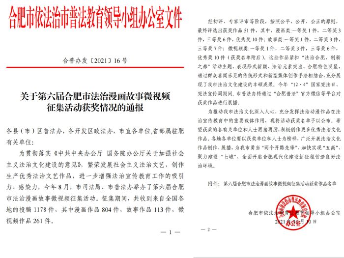 日前,第六届合肥市法治漫画故事微视频活动获奖名单公布,我校作品《防控疫情,法治同行》荣获漫画类优秀奖。