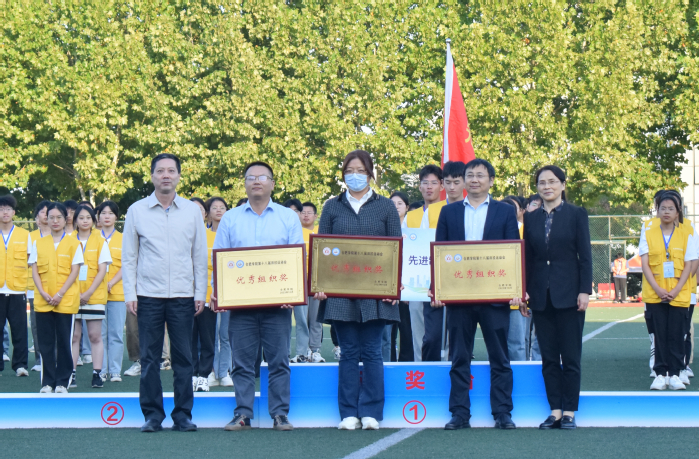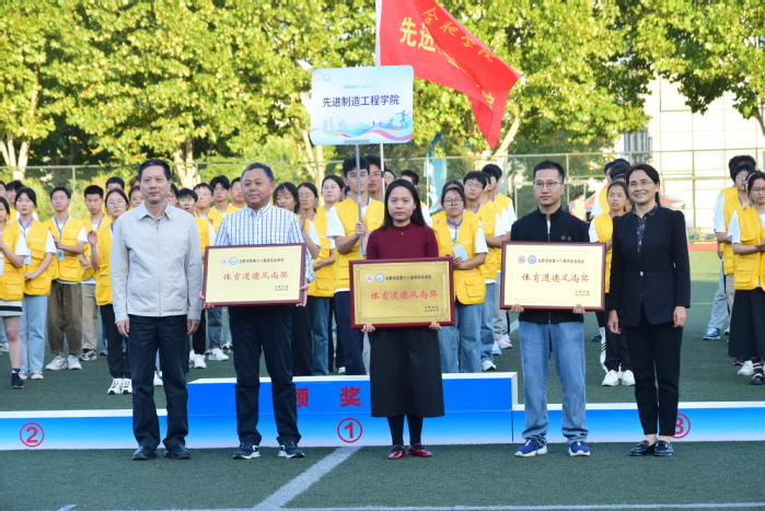 闭幕式开始,陈秀宣读本次比赛结果:能源材料与化工学院、语言文化与传媒学院、研究生代表队荣获最佳组织奖;先进制造工程学院、教育学院、人工智能与大数据学院代表队荣获体育道德风尚奖;先进制造工程学院代表队荣获团体奖第一名;人工智能与大数据学院、经济与管理学院、设计学院代表队荣获团体奖第二名;教育学院、生物食品与环境学院、城市建设与交通学院、研究生代表队荣获团体奖第三名。校领导为获奖单位颁奖。