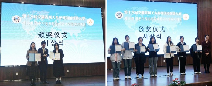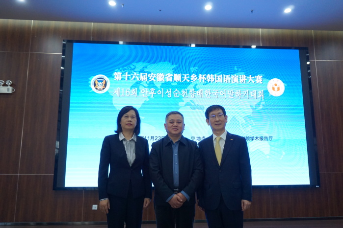 11月23日,由安徽省教育厅主办、合肥学院和韩国顺天乡大学承办的第十六届安徽省顺天乡杯韩国语演讲大赛在我校成功举办。安徽省教育厅外事处处长姚德勇、院长吴春梅和顺天乡大学副校长金瑃淳在开幕式上致辞,顺天乡大学柳炳旭、金仁荣和林丽明三位教授担任大赛评委。