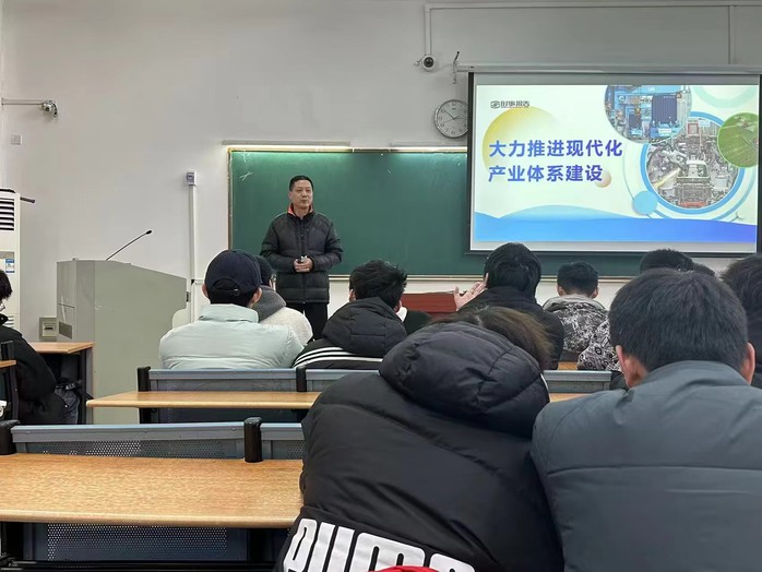 为充分发挥领导干部在思政课建设中的示范作用,提升思政课的教学效果,12月15日下午,党委副书记刘建中以“大力推进现代化产业体系建设”为主题,给23级集成电路设计与集成系统和23级智能制造工程专业的本科生讲授了一堂精彩的思政课。