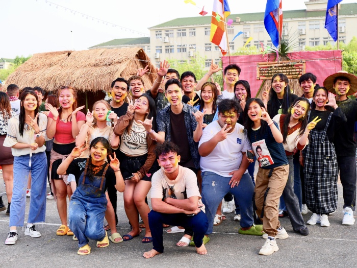 当天下午举办的文艺汇演中,各国同学载歌载舞,展现了多元文化和各国文明交流互鉴、融合发展的和谐面貌。在互动环节中,柬埔寨传统游戏“抢树枝”、“面粉挑糖果”吸引了各国同学积极参与,泼水活动更是将整个庆祝活动推向了高潮,溅起的水花表达了对彼此的祝福和对来年的期望,一声声“新年快乐”在此刻显得格外真挚。